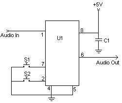 Эта схема при всей простоте позволяет регулировать громкость двумя кнопками! Микросхема - DS1669 конденсатор 0,1мкФ.